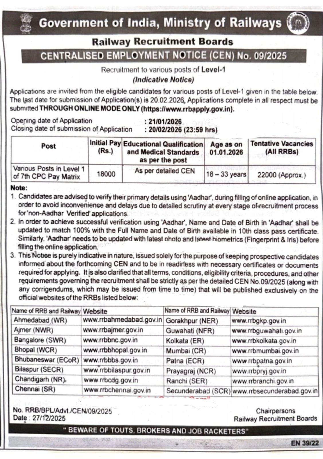 RRB Group D Vacancy 2026 उन उम्मीदवारों के लिए एक सुनहरा अवसर है, जो भारतीय रेलवे में सरकारी नौकरी करने का सपना देख रहे हैं। रेलवे रिक्रूटमेंट बोर्ड (RRB) द्वारा ग्रुप डी के लगभग 22,000 रिक्त पदों पर भर्ती के लिए शॉर्ट नोटिस जारी कर दिया गया है। इस भर्ती प्रक्रिया के तहत योग्य और इच्छुक अभ्यर्थी 21 जनवरी 2026 से 20 फरवरी 2026 के बीच ऑनलाइन आवेदन कर सकेंगे।